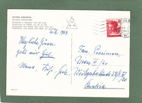 AK Milano Marittima. Grattacieli e Alberghi visti dal mare. Gelaufen 1963 in Cervia Milano Marittima. Großformat. Verlag: A B R. Nummeriert: 25. Zustand: obere Ecken geknickt, Ecken und am Rand etwas angestoßen.