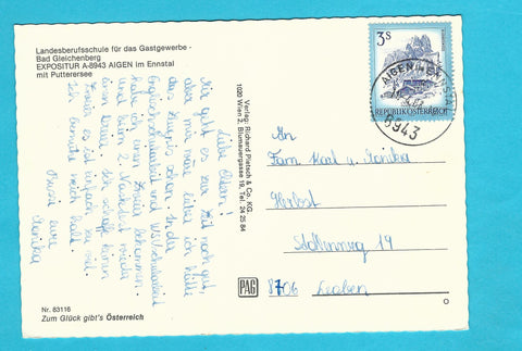 AK Aigen im Ennstal. Landesberufsschule für das Gastgewerbe Bad Gleichenberg Expositur. mit Putterersee. Gelaufen. Großformat. Verlag: Pietsch. Nummeriert: 83116. Zustand: gut.