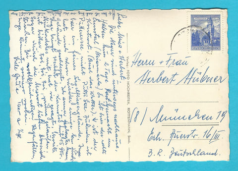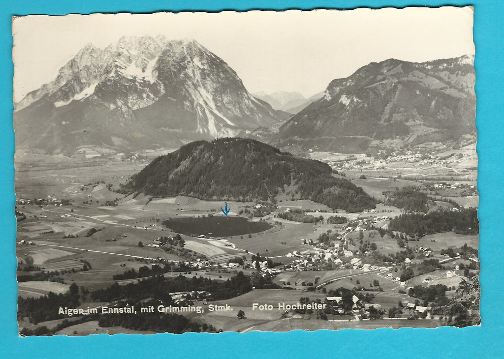AK Aigen im Ennstal mit Grimming. Gelaufen. Großformat. Verlag: Hochreiter. Zustand: gut, Kugelschreiberpfeil in Bildmitte.