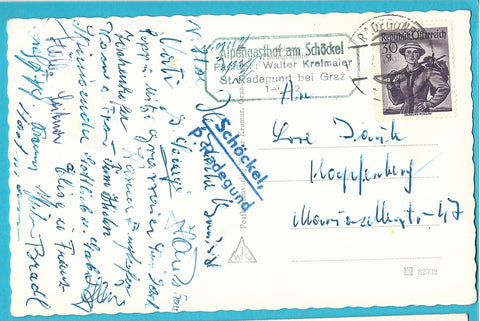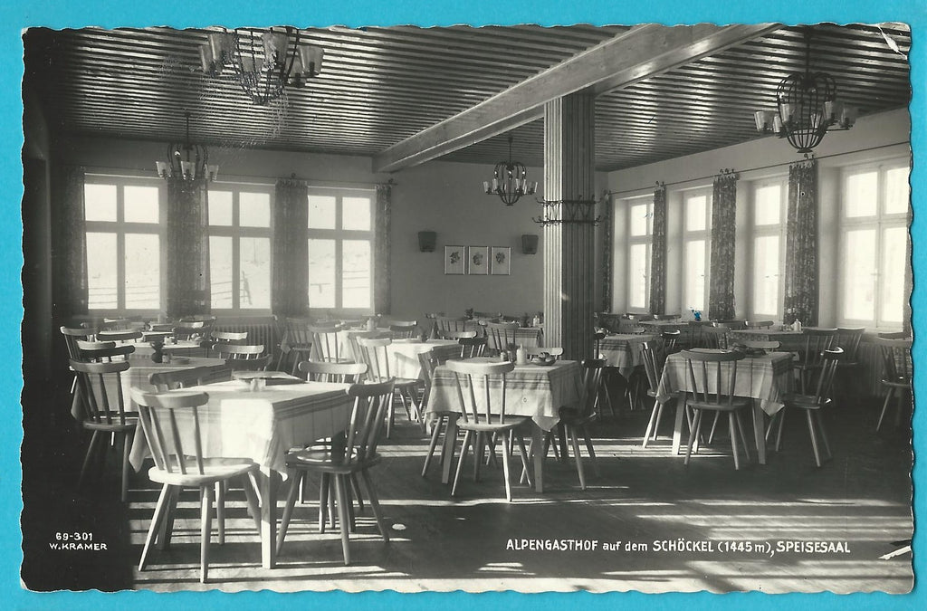 AK Alpengasthof auf dem Schöckel, Speisesaal. Gelaufen. Kleinformat. Verlag: Kramer. Zustand: obere Ecken geknickt, sonst leichte Knicke.