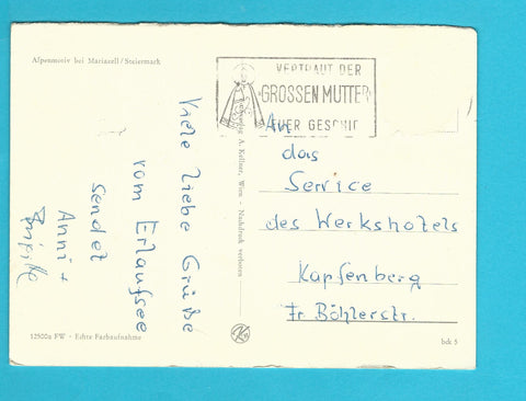 AK Alpenmotiv bei Mariazell. Gelaufen, aber Briefmarke wurde entfernt. Großformat. Verlag: Kellner. Nummeriert: 12500a FW. Zustand: stärker bestoßen.