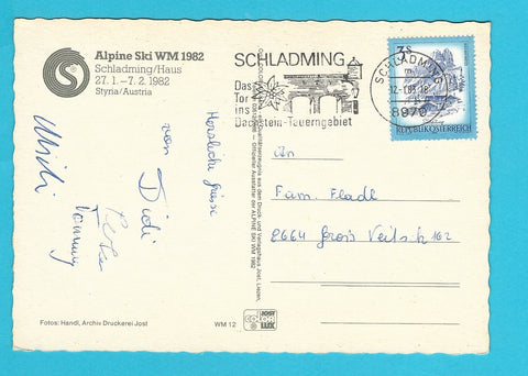 AK Alpine Ski WM 82. Schladming/Haus. Gelaufen. Großformat. Verlag: Colorlux. Nummeriert: WM 12. Zustand: rechtes oberes und linkes unteres Eck geknickt.