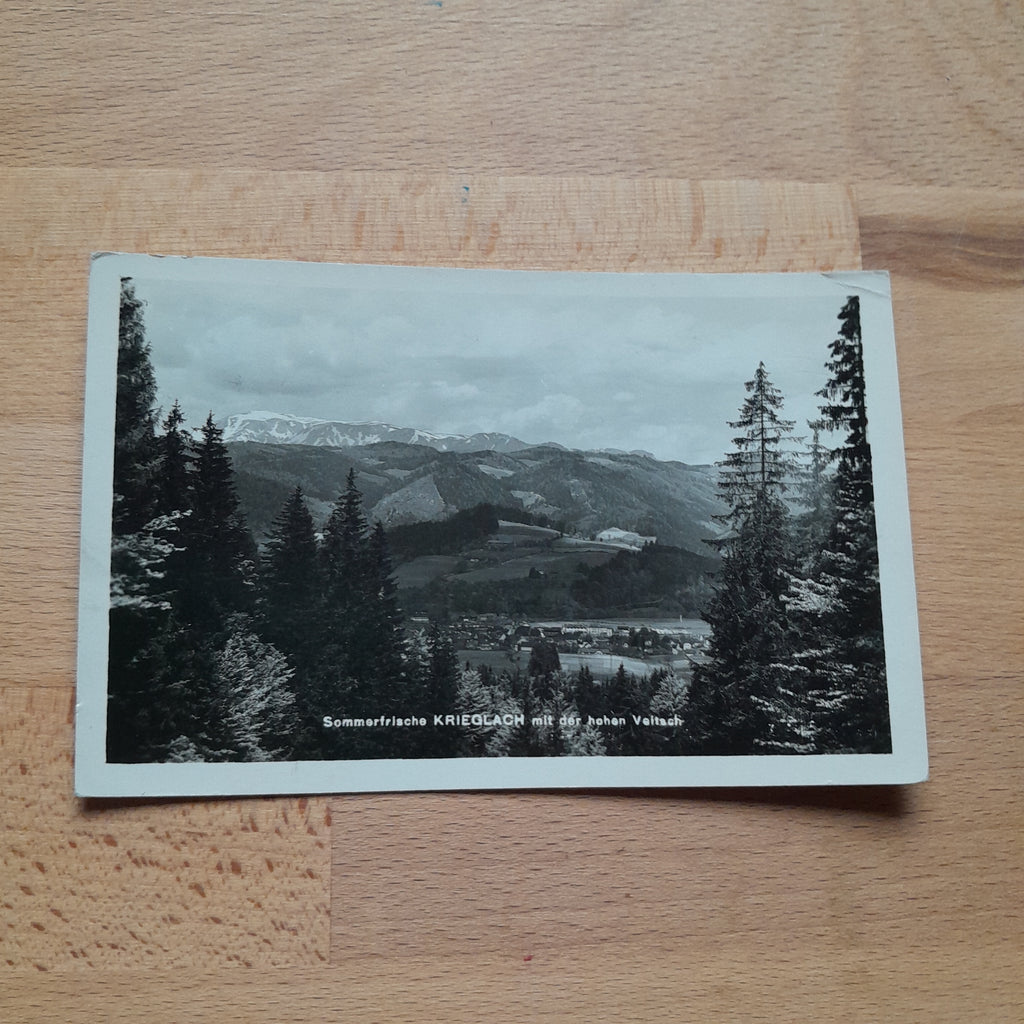 AK Krieglach mit der Hohen Veitsch. Gelaufen. Kleinformat. Zustand: gut, rechtes oberes Eck geknickt.
