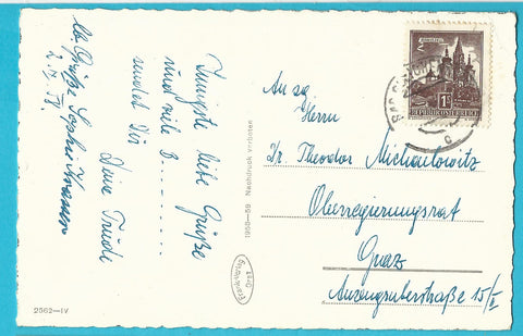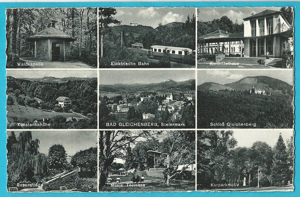 AK Bad Gleichenberg. (1958-59) Gelaufen. Kleinformat. Verlag: Frank. Nummeriert: 2562-IV Zustand: linkes oberes und rechtes unteres Eck geknickt, Oberfläche knittrig.