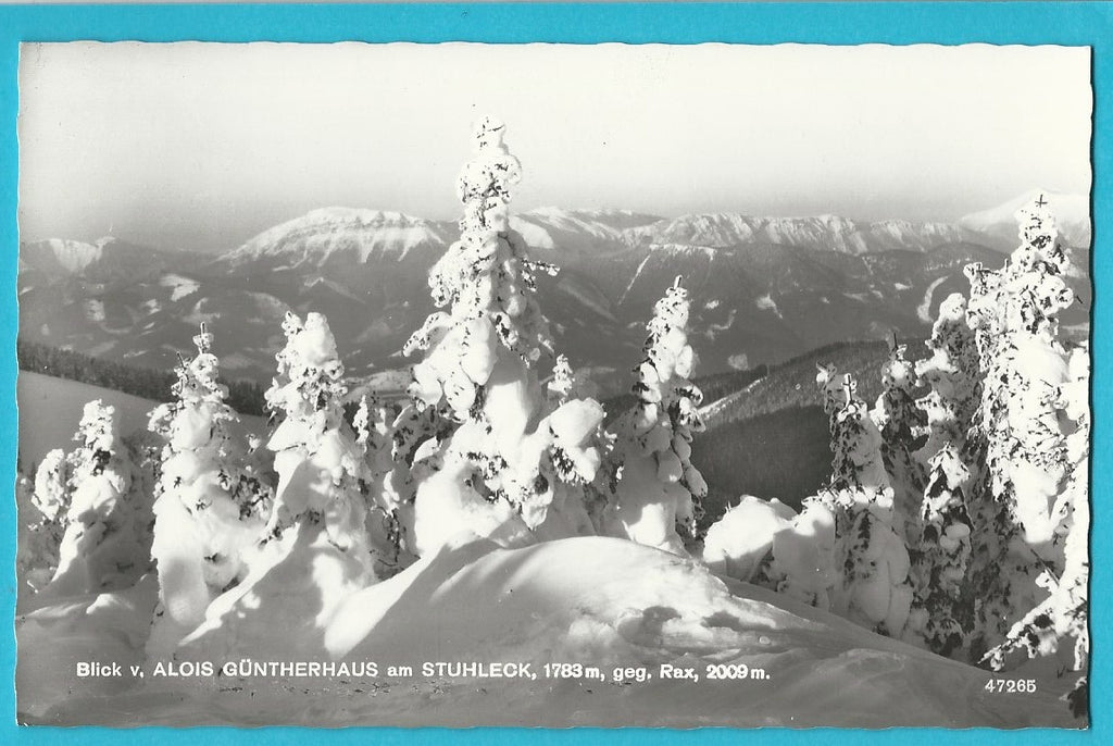 AK Blick v. Alois Güntherhaus am Stuhleck geg. Rax. (1964) Ungelaufen. Kleinformat. Verlag: Ledermann. Nummeriert: 47265. Zustand: gut. Steinhaus am Semmering.