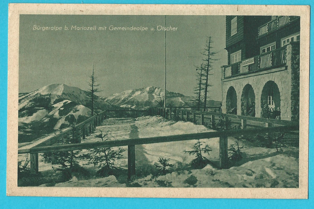 AK Bürgeralpe b. Mariazell mit Gemeindealpe u. Ötscher. Ungelaufen. Kleinformat. Verlag: Radinger. Nummeriert: 2525. Zustand: gut, linkes oberes Eck angeknickt.