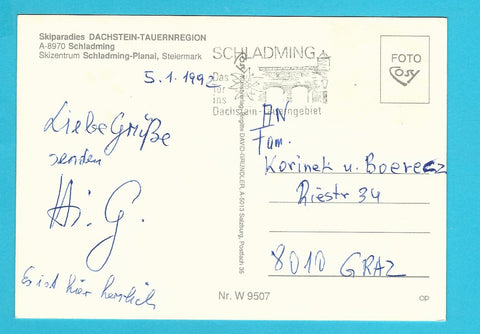 AK Dachstein Tauernregion Schladming, aber Briefmarke wurde entfernt. Gelaufen. Großformat. Verlag: Cosy. Nummeriert: W 9507. Zustand: Knick links der Bildmitte.