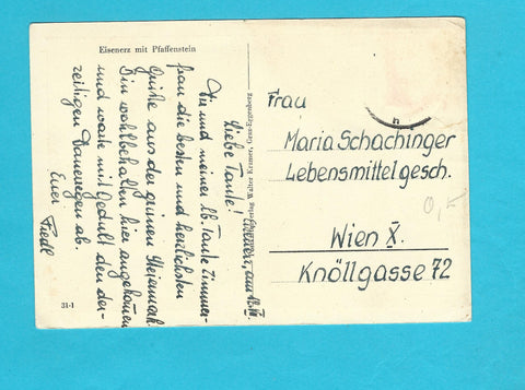 AK Eisenerz mit Pfaffenstein. Gelaufen, aber Briefmarke wurde entfernt. Großformat. Verlag. Kramer. Nummeriert: 31-1. Zustand: Ecken und am oberen Rand geknickt.