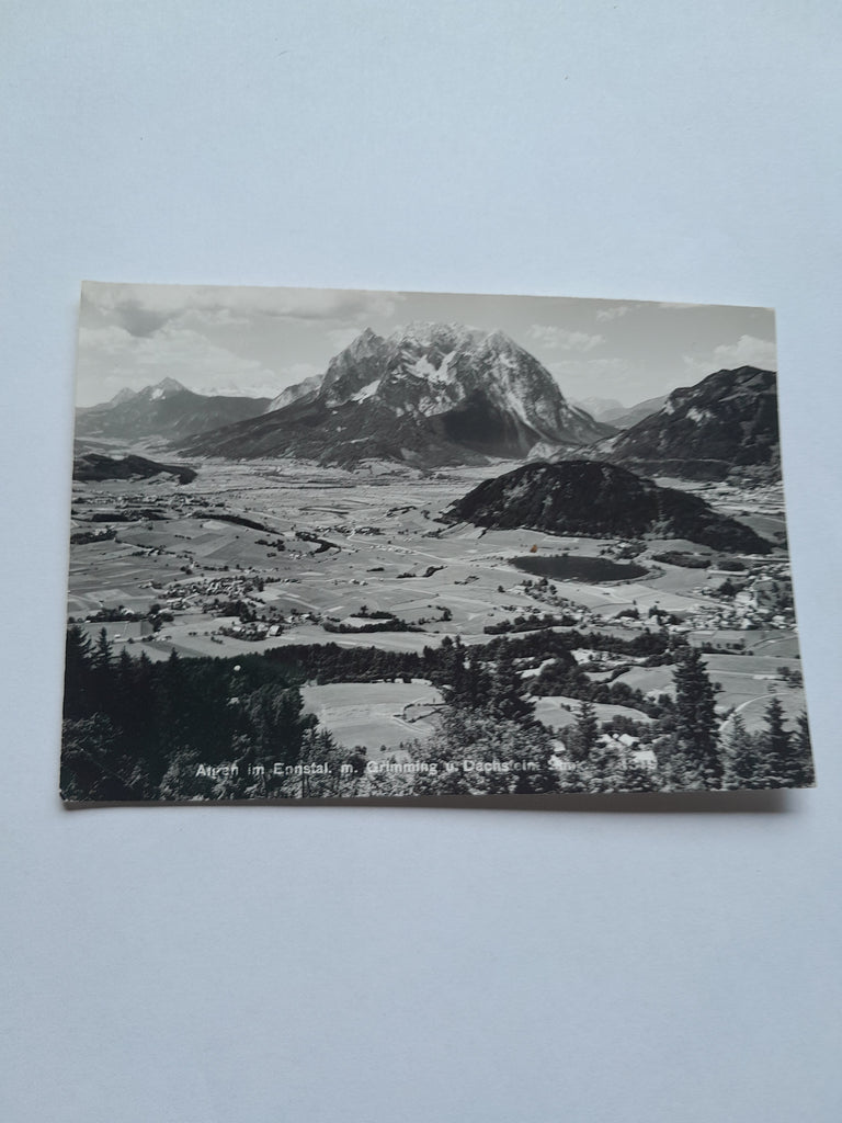 AK Aigen im Ennstal mit Grimming. Gelaufen. Großformat. Verlag: Baumgartner. Nummeriert: 1319. Zustand: gut, linkes unteres Eck geknickt.