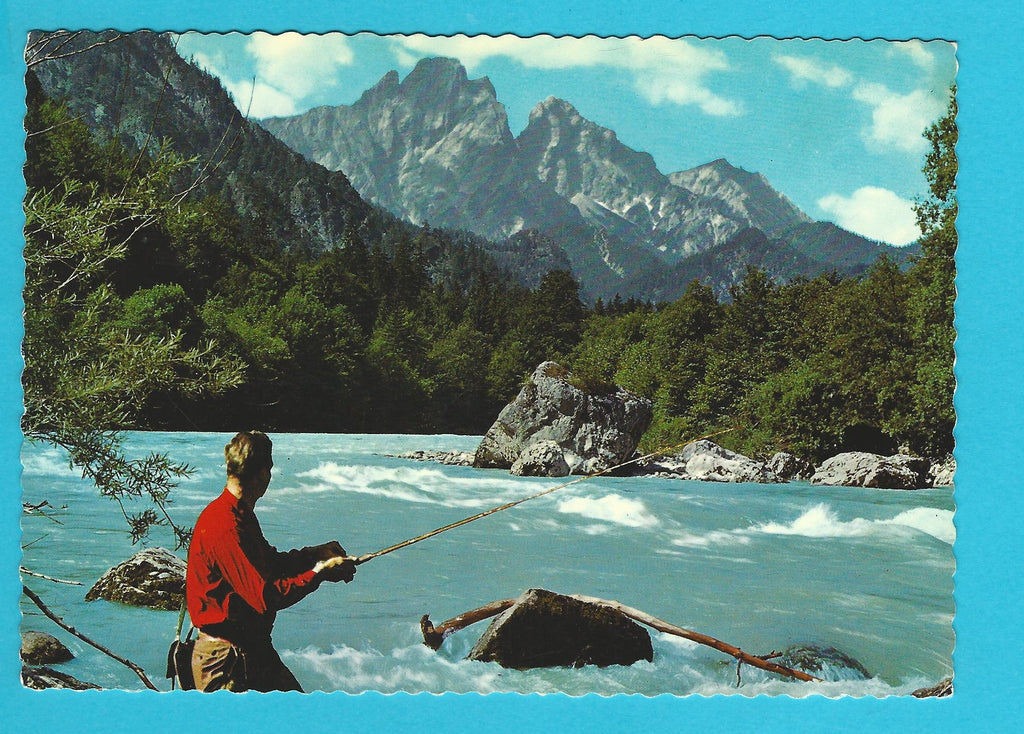 AK Gesäuse. (Fliegenfischer) Gelaufen. Großformat. Verlag: Hruby Nummeriert: 8038. Zustand: gut, leicht bestoßen.