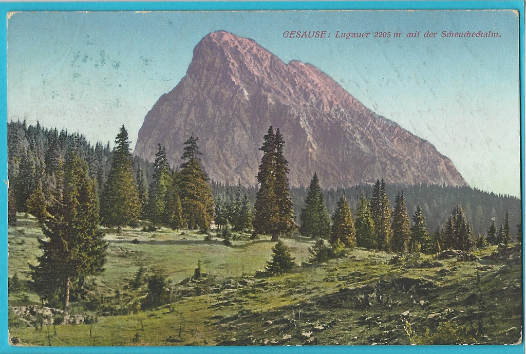 Admont gegen die Hallermauern (1914) AK Gesäuse: Lugauer mit der Scheucheckalm. (1912) Gelaufen, aber Briefmarke wurde entfernt. Kleinformat. Verlag: Knollmüller. Nummeriert: 6178. Zustand: Kleberückstände an Rückseite.