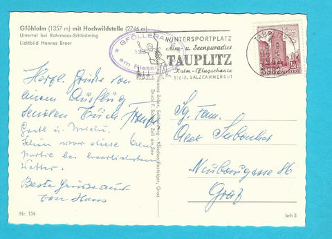 AK Gföhlalm mit Hochwildstelle. Untertal bei Rohrmoos-Schladming. Gelaufen. Großformat. Verlag: Broer. Nummeriert: 134. Zustand: gut.