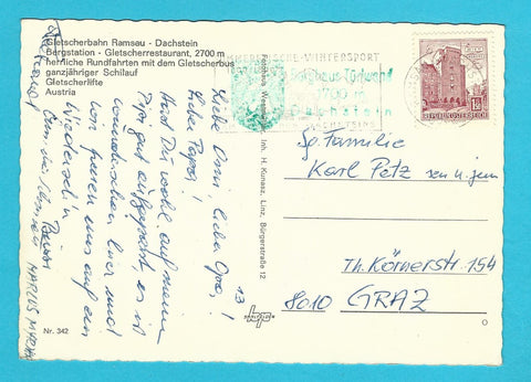 AK Gletscherbahn Ramsau. Bergstation - Gletscherrestaurant. Gelaufen. Großformat. Verlag: Westmüller. Nummeriert: 342. Zustand: linke Ecken geknickt.