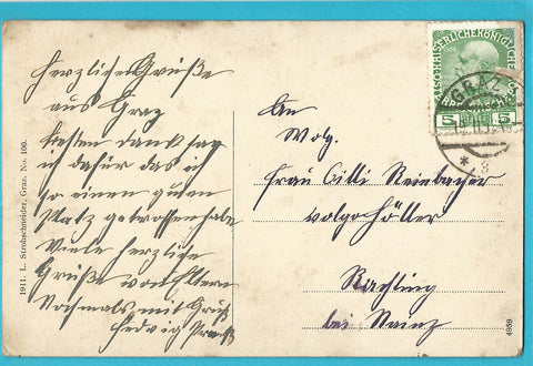 AK Graz - Hauptplatz. (1911) Gelaufen. Kleinformat. Verlag: Strohschneider. Nummeriert: 100. Zustand: Knick über dem linken oberen Eck, Ecken leicht angestoßen.