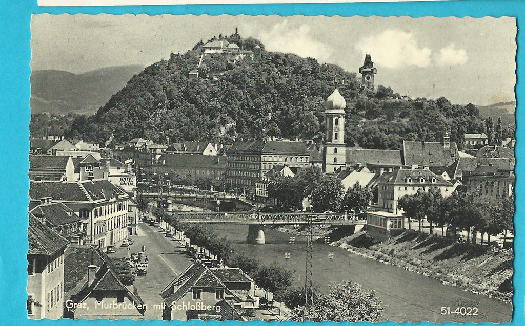 AK Graz, Murbrücke mit Schloßberg. Gelaufen. Kleinformat. Verlag: Kramer. Nummeriert: 51-4022. Zustand: Oberfäche knittrig.