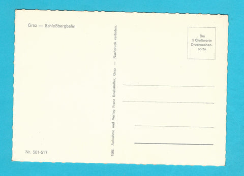 AK Graz - Schloßbergbahn. (1968) Ungelaufen. Großformat. Verlag: Knollmüller. Nummeriert: 501-517. Zustand: rechtes unteres Eck geknickt.