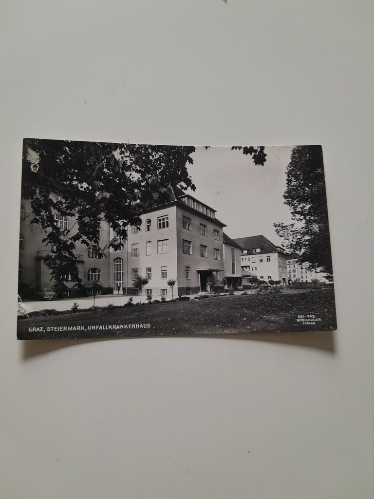AK Graz. Unfallkrankenhaus. Gelaufen. Kleinformat. Verlag: Knollmüller. Nummeriert: 501-749. Zustand: linkes unteres Eck geknickt, Einriss am linken Rand.