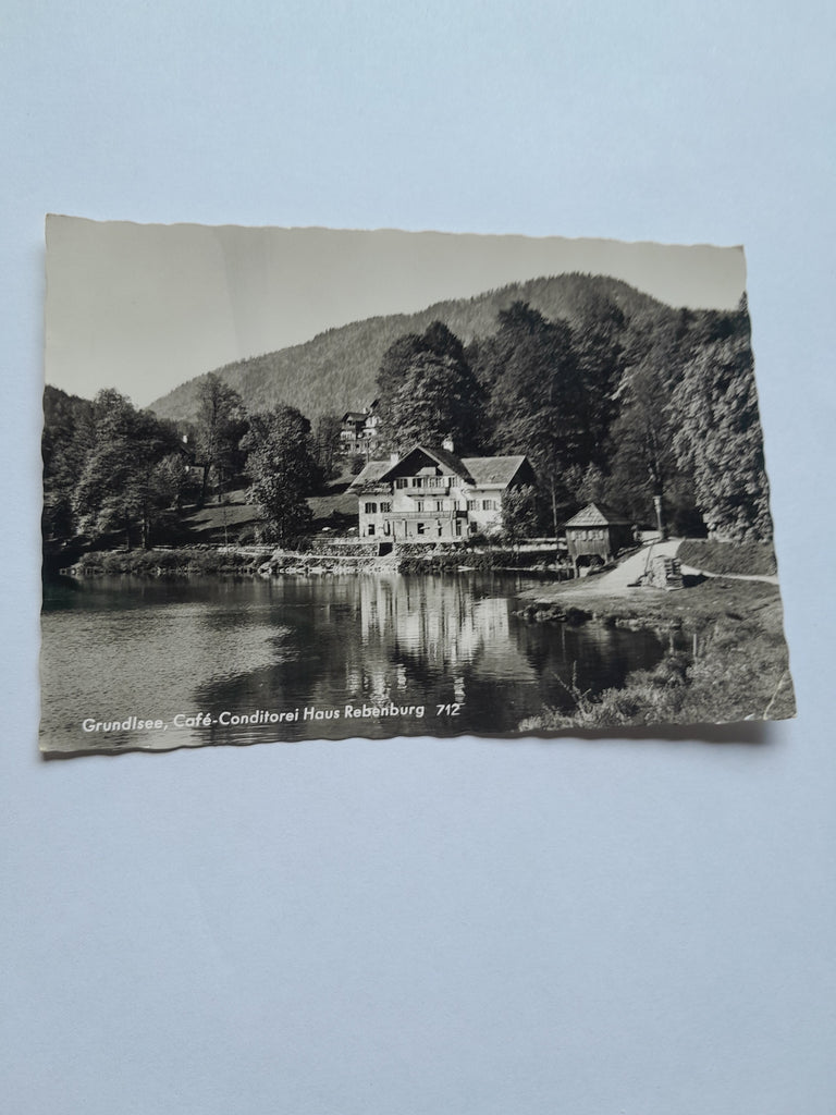 AK Grundlsee, Cafe Conditorei Haus Rebenburg. Gelaufen. Großformat. Verlag: Rastl. Nummeriert: 712. Zustand: gut, rechtes unteres Eck geknickt.