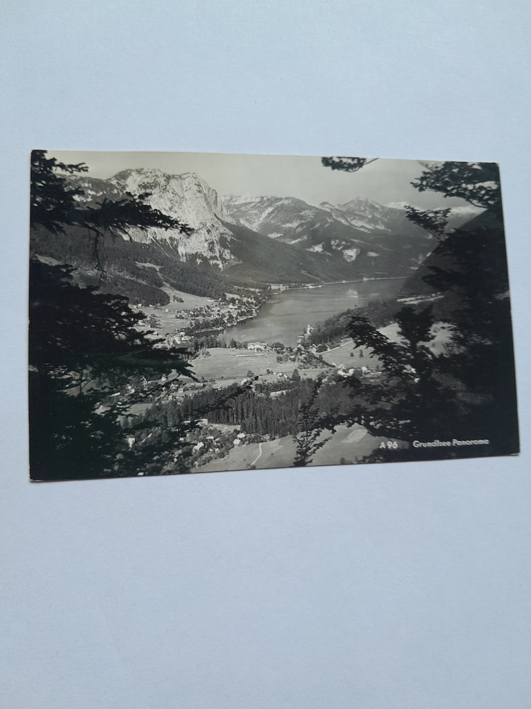 AK Grundlsee Panorama. Gelaufen, aber Briefmarke wurde entfernt. Kleinformat. Verlag: Bährendt. Nummeriert: A 96. Zustand: leicht bestoßen.