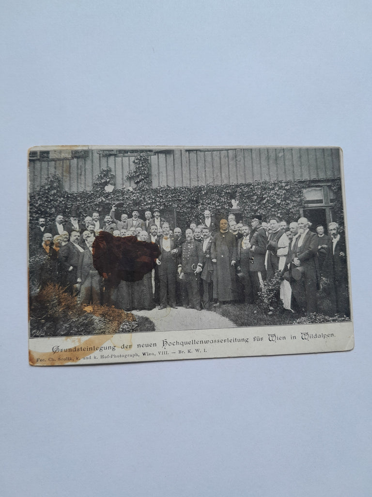 AK Grundsteinlegung der neuen Hochquellenwasserleitung für Wien in Wildalpen. Ungelaufen. Kleinformat. Verlag: Scolik. Zustand: stark fleckig.
