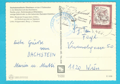 AK Grüße vom Dachstein. Gelaufen. Großformat. Verlag: Luftbild Scheurecker. Nummeriert: C 1210. Zustand: rechtes oberes Eck geknickt, sonst O.k.