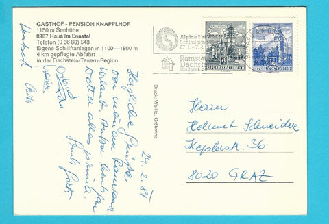 AK Haus im Ennstal. Gasthof - Pension Knapplhof. Schiliftstüberl. Gelaufen. Großformat. Verlag: Wallig. Zustand: gut, Kugelschreibermarkierung im rechten unteren Eck.
