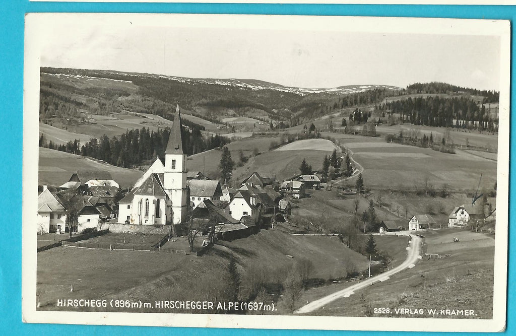 AK Hirschegg mit Hirschegger Alpe. Gelaufen. Kleinformat. Verlag: Kramer Nummeriert: 2528. Zustand: gut, beim rechten Rand Pfeil.