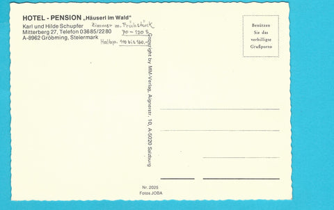 AK Hotel Pension Häuserl im Wald Karl und Hilde Schupfer. Mitterberg 27. Ungelaufen. Großformat. Verlag: MM. Nummeriert: 2025. Zustand: gut.