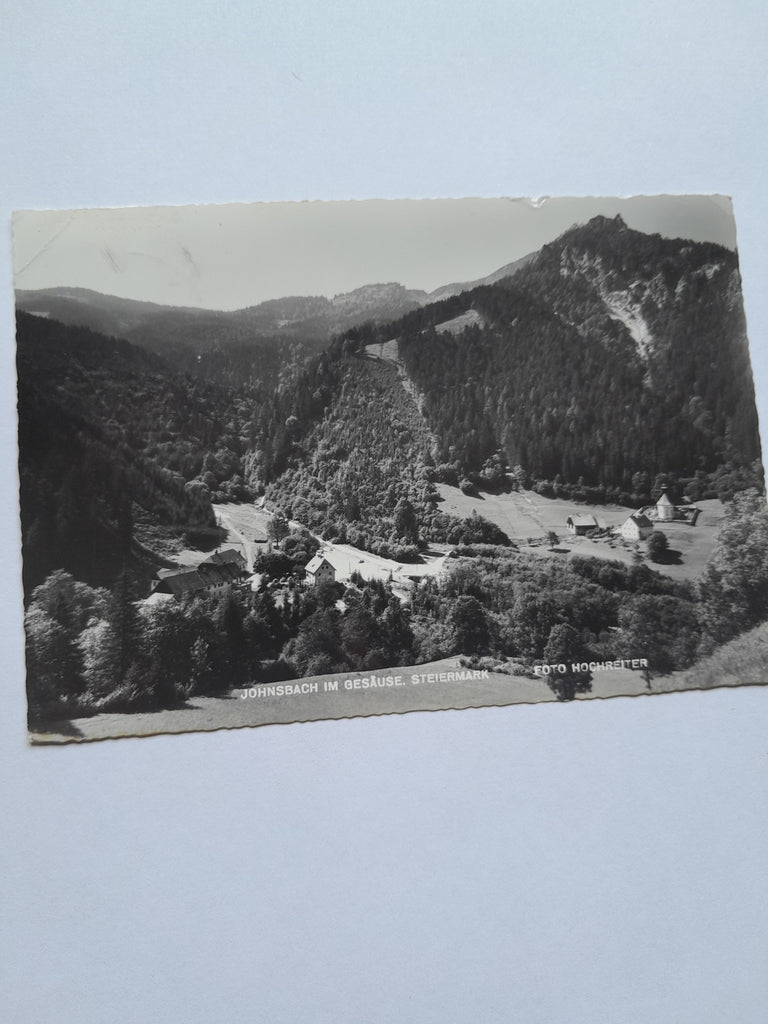 AK Johnsbach im Gesäuse. Gelaufen, aber Briefmarke wurde entfernt. Großformat. Verlag: Hochreiter. Zustand: obere Ecken geknickt, Einriss am oberen Rand.