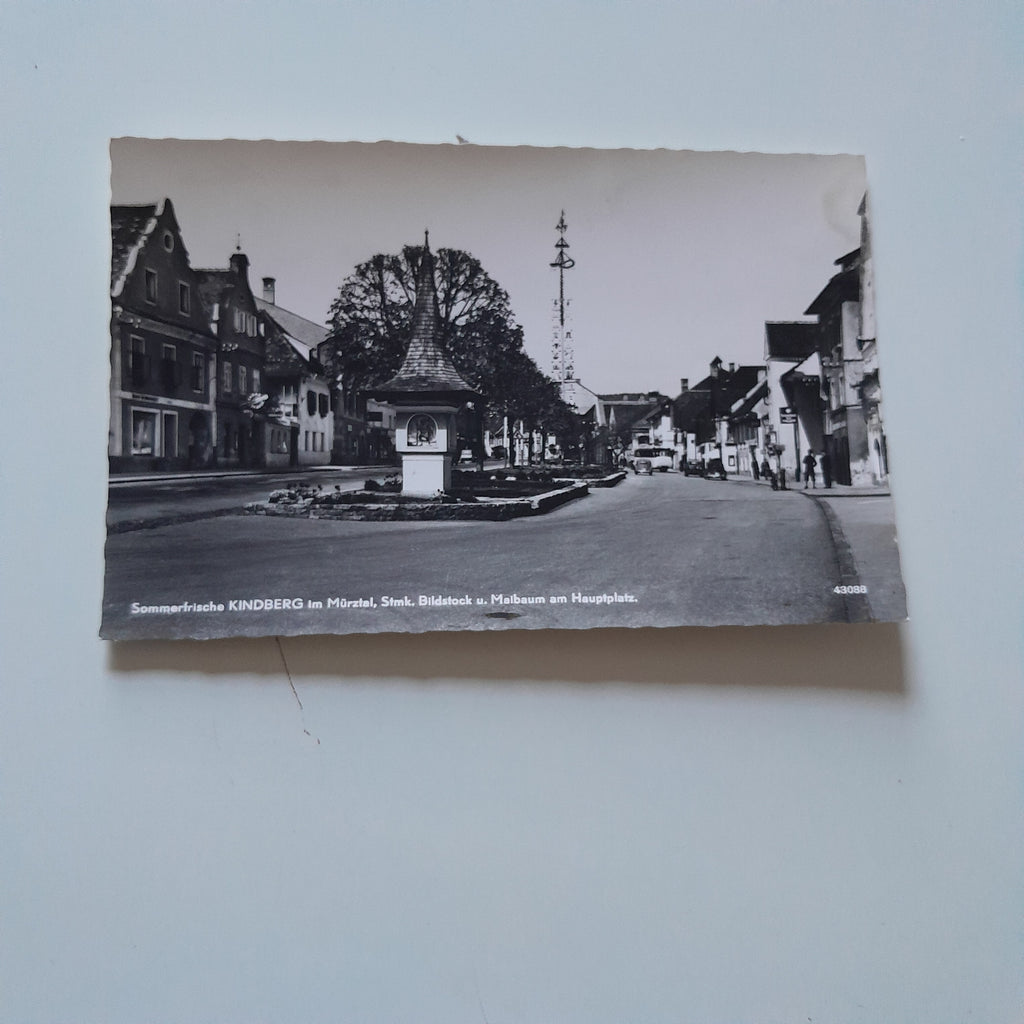 AK Kindberg im Mürztal. Bildstock u. Maibaum am Hauptplatz. (1965) Ungelaufen. Kleinformat. Verlag: Ledermann. Nummeriert: 43088. Zustand: gut.