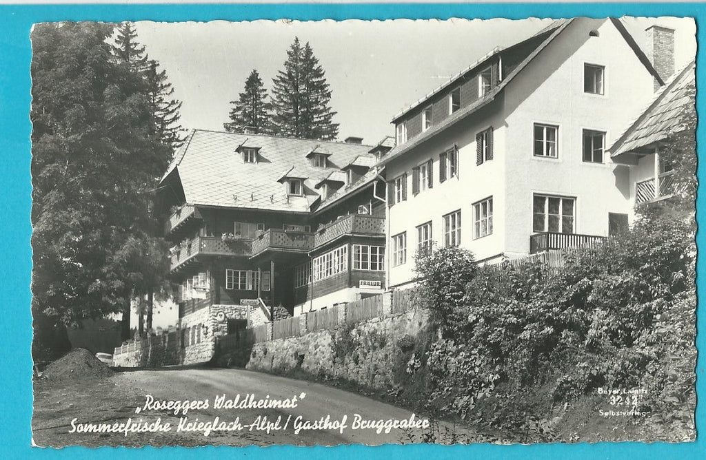 AK Krieglach-Alpl. Gasthof Bruggraber. Roseggers Waldheimat. Gelaufen. Kleinformat. Verlag: Bayer. Nummeriert: 3242. Zustand: gut.