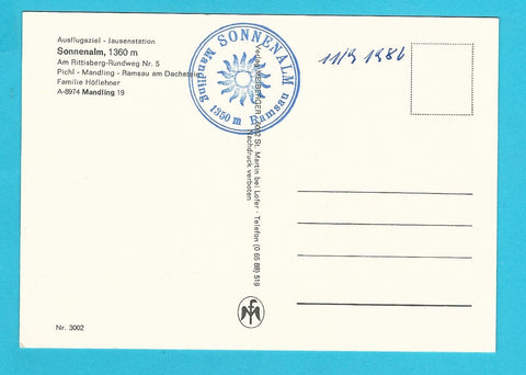 AK Mandling 19. Sonnenalm. Am Rittisberg-Rundweg Nr. 5. Familie Höflehner. Ungelaufen. Großformat. Verlag: Meiberger. Nummeriert: 3002. Zustand: gut, rechtes unteres Eck angeknickt.