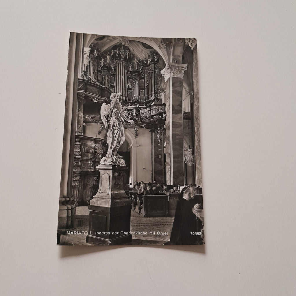 AK Mariazell. Inneres der Gnadenkirche mit Orgel. Gelaufen. Kleinformat. Verlag: Ledermann. Nummeriert: 72583. Zustand: gut, linkes unteres Eck geknickt.