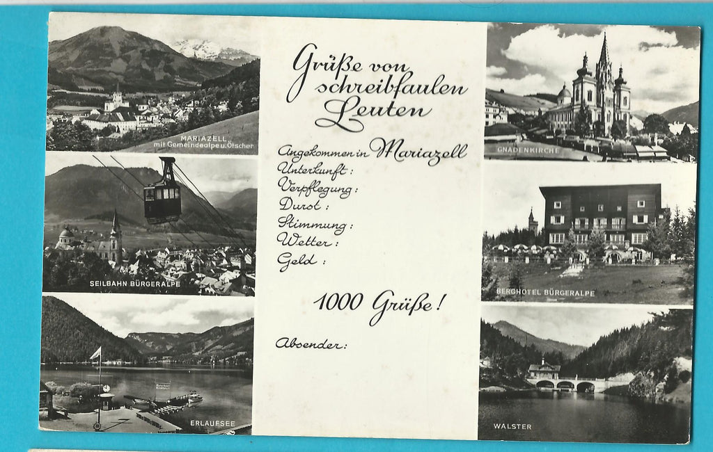 AK Mariazell. Grüße von schreibfaulen Leuten. (1960) Gelaufen. Kleinformat. Verlag: Ledermann. Zustand: gut.