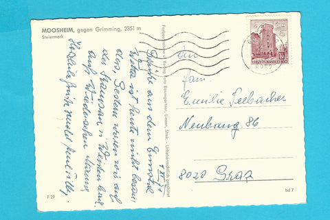 AK Moosheim gegen Grimming. Gelaufen. Großformat. Verlag: Baumgartner. Nummeriert: F 29. Zustand: Ecken und am Rand geknickt.