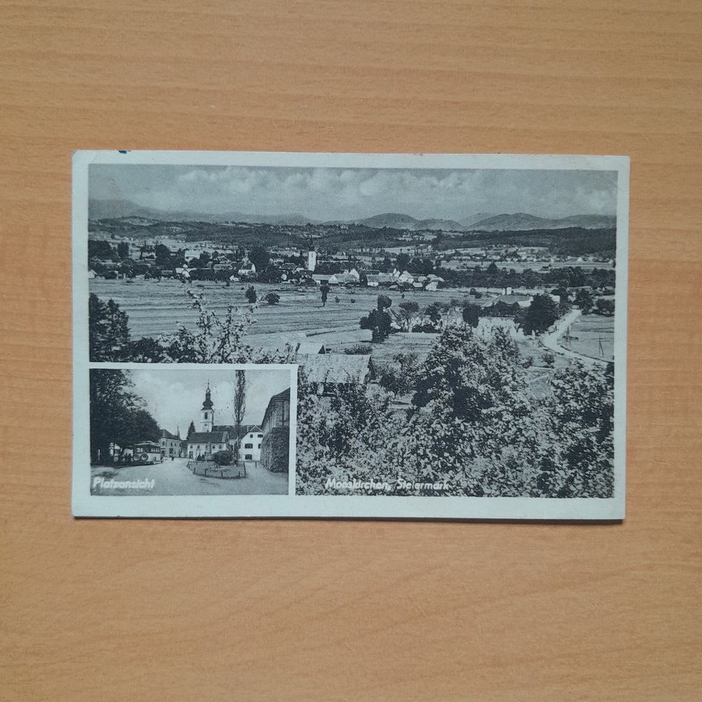 AK Mooskirchen. Platzansicht. (1948-49) Gelaufen. Kleinformat. Verlag: Frank. Nummeriert: 2508-9. Zustand: gut, obere Ecken leicht geknickt.