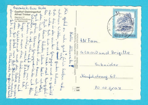 AK Pichl/Enns. Gasthof Gleimingerhof. Alfred Trinker. Gleiming 27. Gelaufen. Großformat. Verlag: Elfi. Zustand: gut, Kugelschreibermarkierungen rechts neben der Bildmitte.