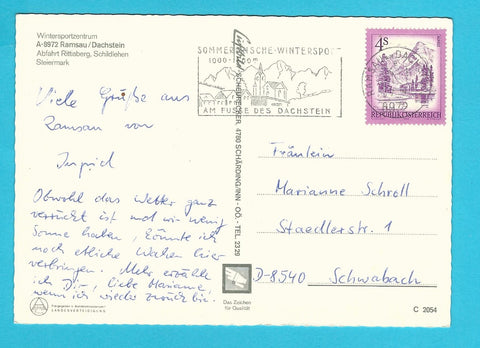AK Ramsau am Dachstein. Gelaufen. Großformat. Verlag: Luftbild Scheurecker. Nummeriert: C 2054. Zustand: gut, linkes oberes Eck angeknickt.