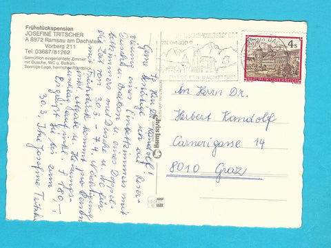 AK Ramsau am Dachstein. Frühstückspension Josefine Tritscher. Vorberg 211. Gelaufen. Großformat. Verlag: Lang. Zustand: leichte Knicke.
