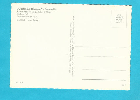 AK Ramsau am Dachstein. Gästehaus Hermann. Sonnenlift. Vorberg 163. Ungelaufen. Großformat. Verlag: Broer. Nummeriert: 1045. Zustand: gut, leicht fleckig.