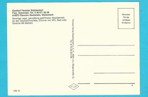 AK Ramsau am Dachstein. Gasthof Pension Brückenhof. Fam. Schrempf. Ungelaufen. Großformat. Verlag: Kunasz. Nummeriert: HW 15. Zustand: gut.