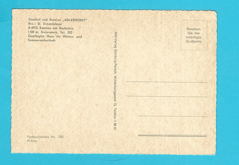 AK Ramsau am Dachstein. Gasthof und Pension Adlerhorst. Bes. D. Simonlehner. Ungelaufen. Großformat. Verlag: MM. Nummeriert: 1201. Zustand: rechtes oberes Eck geknickt.