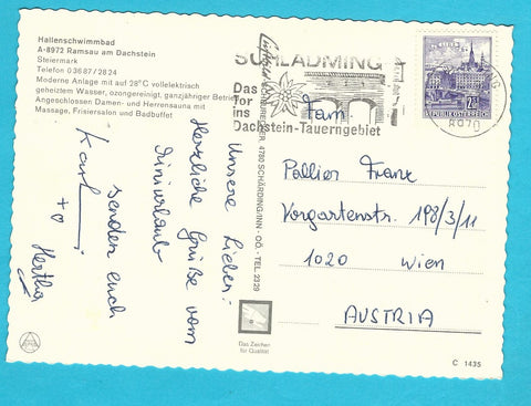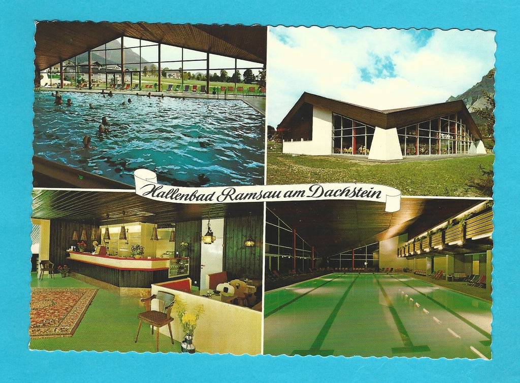 AK Ramsau am Dachstein. Hallenbad. Gelaufen. Großformat. Verlag: Luftbild Scheurecker. Nummeriert: C 1435. Zustand: leichter Knick über dem linken oberen Bild.