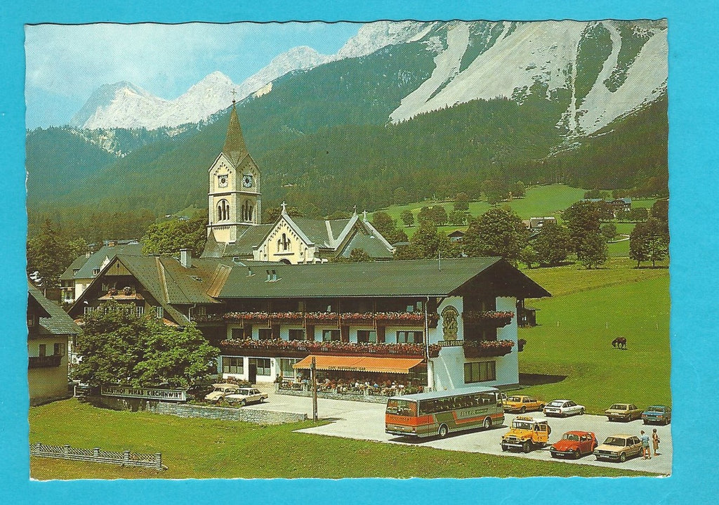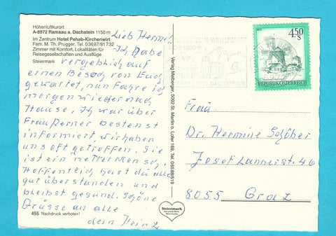 AK Ramsau am Dachstein. Hotel Pehab Kirchenwirt. Gelaufen. Großformat. Verlag: Meiberger. Nummeriert: 455. Zustand: Ecken geknickt.