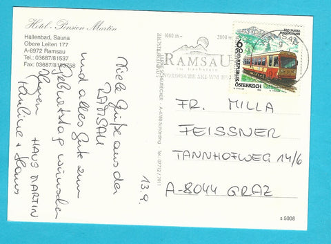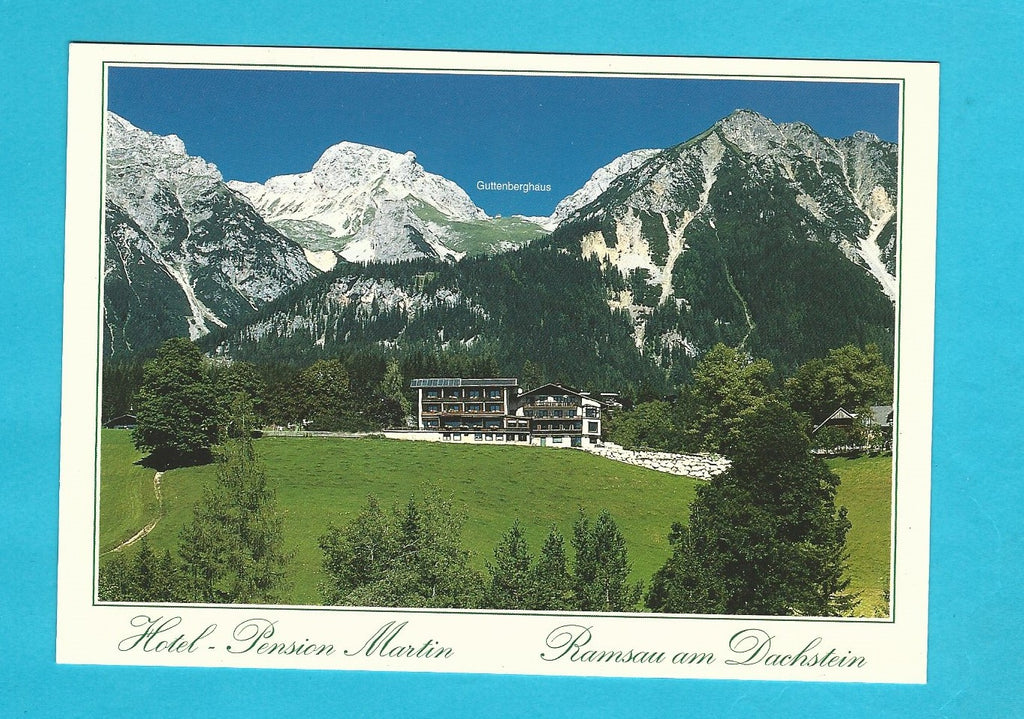 AK Ramsau am Dachstein. Hotel Pension Martin. Gelaufen. Großformat. Verlag: Luftbild Scheurecker. Nummeriert: s 5008. Zustand: gut, rechtes unteres Eck geknickt.