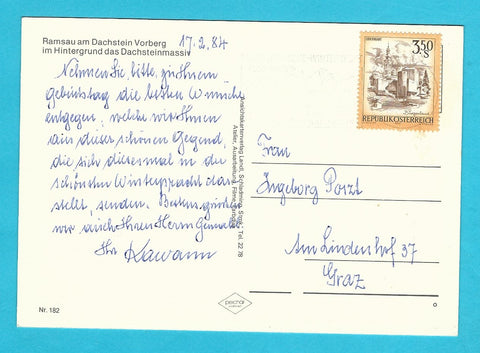AK Ramsau am Dachstein im Hintergrund das Dachsteinmassiv. Gelaufen. Großformat. Verlag: Landl. Nummeriert: 182. Zustand: gut.