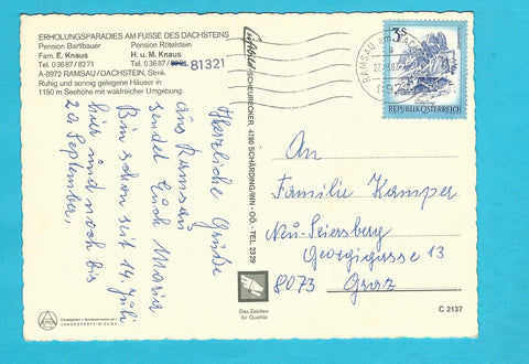 AK Ramsau am Dachstein. Pensionen Bartlbauer, Rötelstein. Gelaufen. Großformat. Verlag: Luftbild Scheurecker. Nummeriert: C 2137. Zustand: gut, Kugelschreiberkreuz rechts unterhalb der Bildmitte.