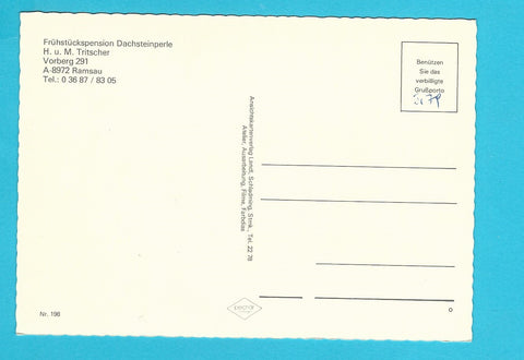 AK Ramsau am Dachstein. Vorberg 291. Frühstückspension Dachsteinperle. H. u. M. Tritscher. Ungelaufen. Großformat. Verlag: Landl. Nummeriert: 198. Zustand: Knick über der rechten unteren Hälfte.