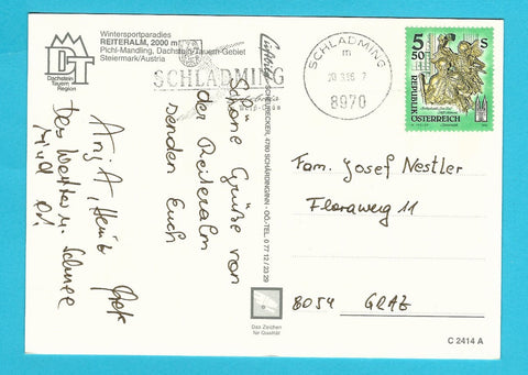 AK Reiteralm. Gelaufen. Großformat. Verlag: Luftbild Scheurecker. Nummeriert: C 2424 A. Zustand: gut, rechtes unteres Eck angeknickt.
