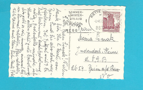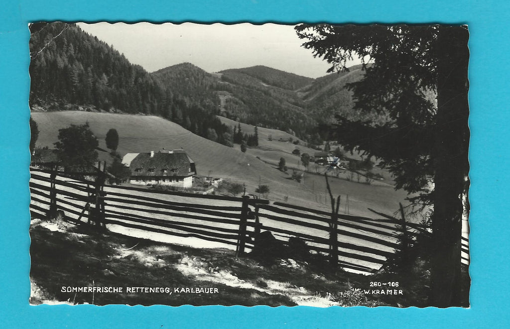 AK Rettenegg, Karlbauer. Gelaufen. Kleinformat. Verlag: Kramer. Nummeriert: 260-106. Zustand: linkes oberes Eck geknickt, Kugelschreiberkreuz rechts der Bildmitte.
